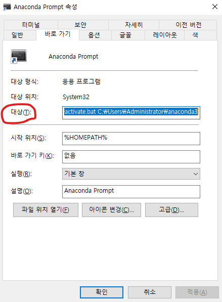 그래서 Anaconda prompt 속성을 살펴보다 대상(T) 경로위치가 이상하다는 걸 깨달았다. 난 Just Me 아나콘다를 설치했는데 ProgramData 폴더로 경로 설정이 되어있는 걸 보고 수정했다.